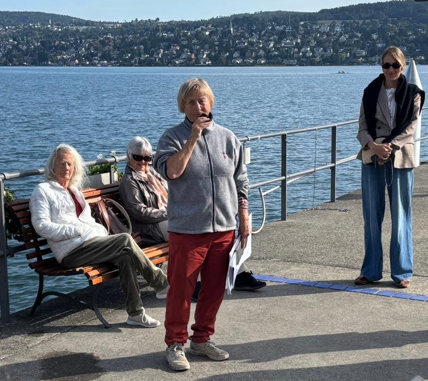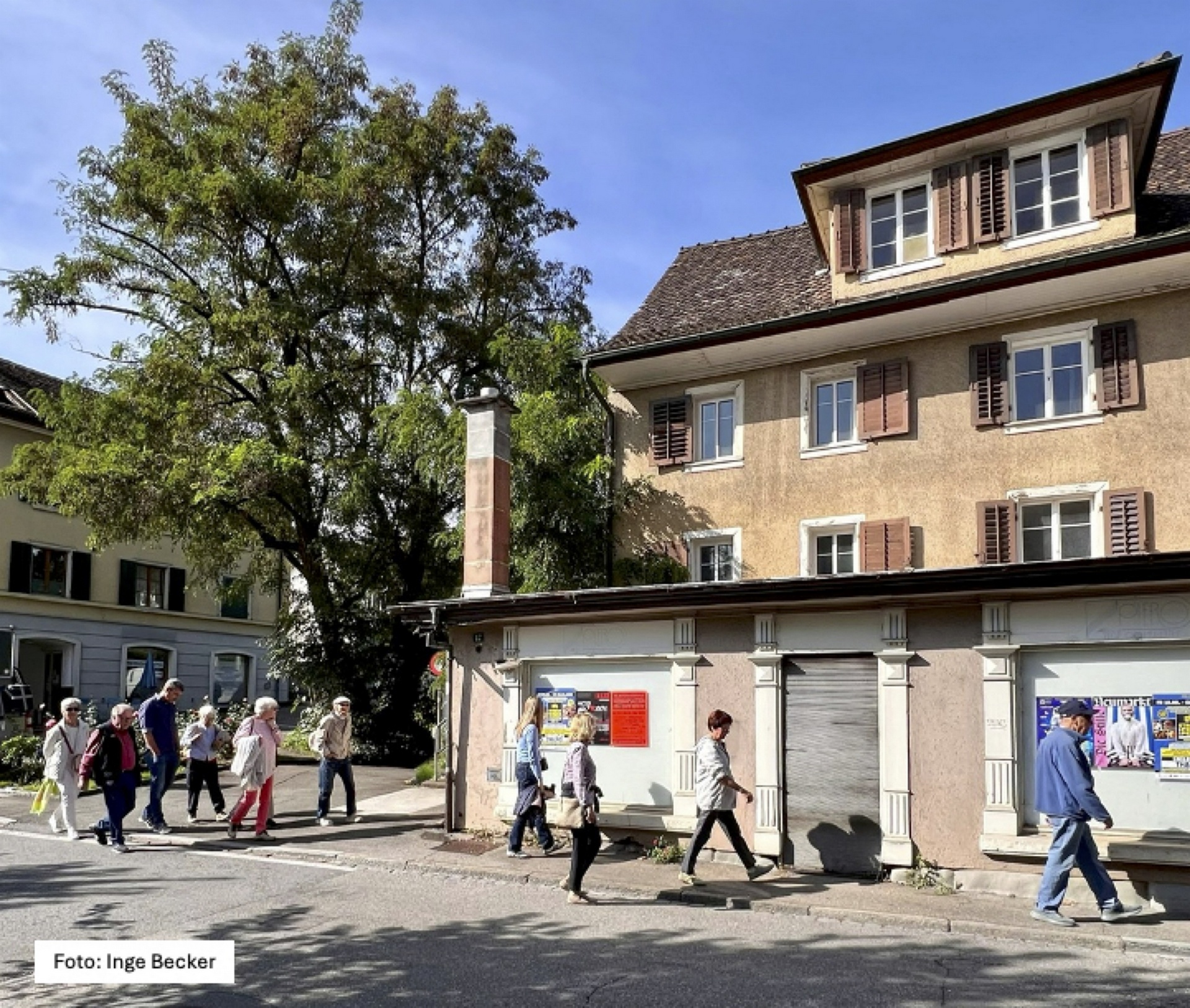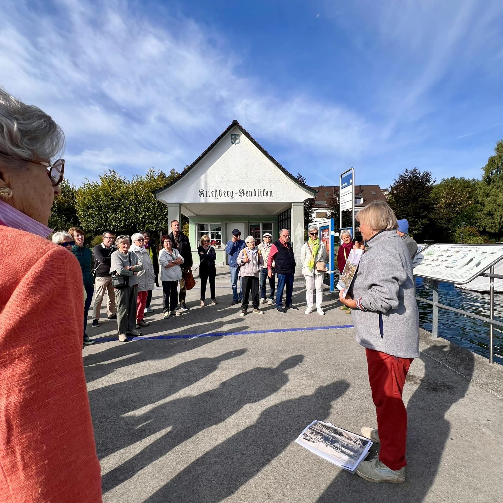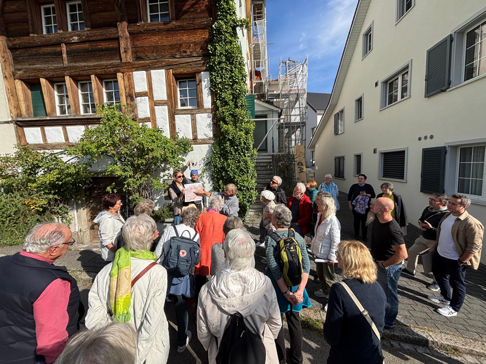 Ein Spaziergang will nicht nur Wissen vermitteln, sondern auch den Weg mit allen Sinnen aufnehmen und neben der Vergangenheit die gegenwärtige Situation achtsam wahrnehmen und in die Zukunft schauen. So machte sich eine stattliche Schar an einem sonnigen Septembermorgen auf den Weg und entdeckte nächst dem Seehüsli den Dorfbach. Er fliesst seit langem auf seinem ganzen Lauf unterirdisch, bis auf die letzten Meter vor dem See, wo man ihn unter einem Drahtgitter hören und sehen kann. Ihn aus dem Untergrund wieder hervorzuholen würde eine grosse Anstrengung bedeuten, könnte aber auch im Hinblick auf die Entwicklung zur „Schwammstadt“ von Bedeutung sein.