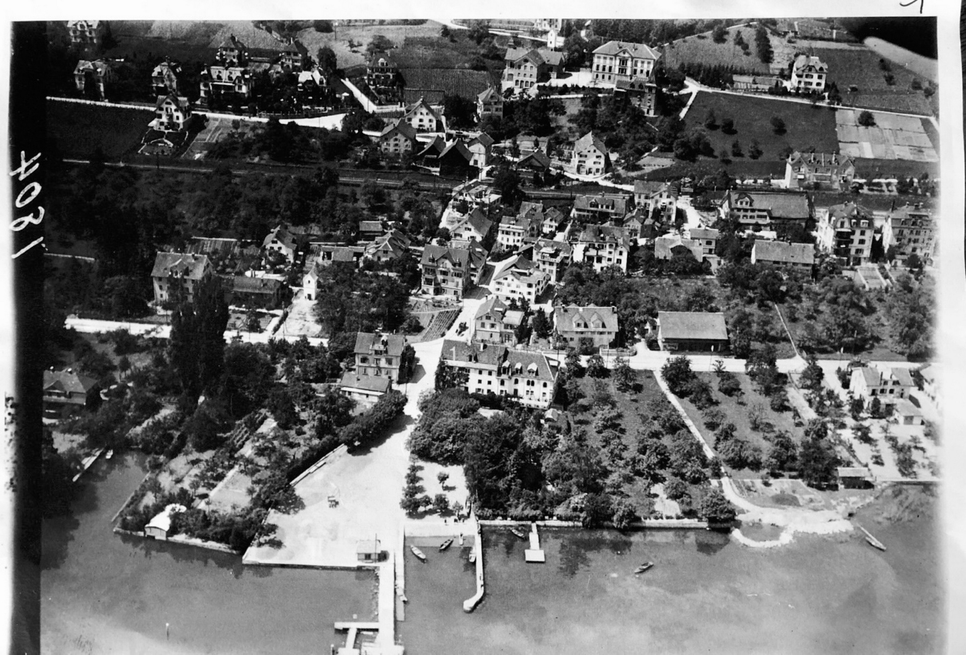 s dem 17. Jahrhundert; weiter oben sich eine kleine verwinkelte Siedlung, die noch etwas vom dörflichen Charakter Bendlikons erahnen lässt, aber heute von manchem eher als Verkehrshindernis wahrgenommen wird. Wir versammeln uns beim alten Plätzchen am Brunnen und schauen uns eine Flugaufnahme von 1919 an - was ist hier geschehen?